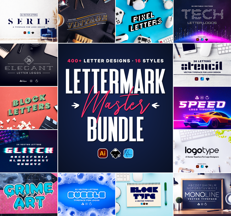 The Lettermark Master Bundle is a collection of 400+ vector letter designs in 16 different styles and formats. It combines versions 1 and 2 of my Lettermark Bundle series at a discounted rate.