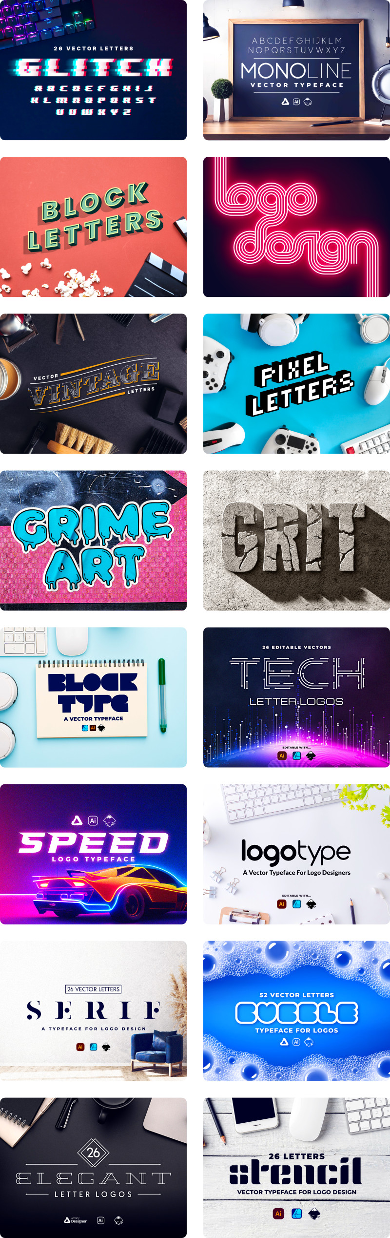 It should be noted that these are vector letter designs and not fonts. These designs are intended to be used for crafting wordmarks, logos, and headers.